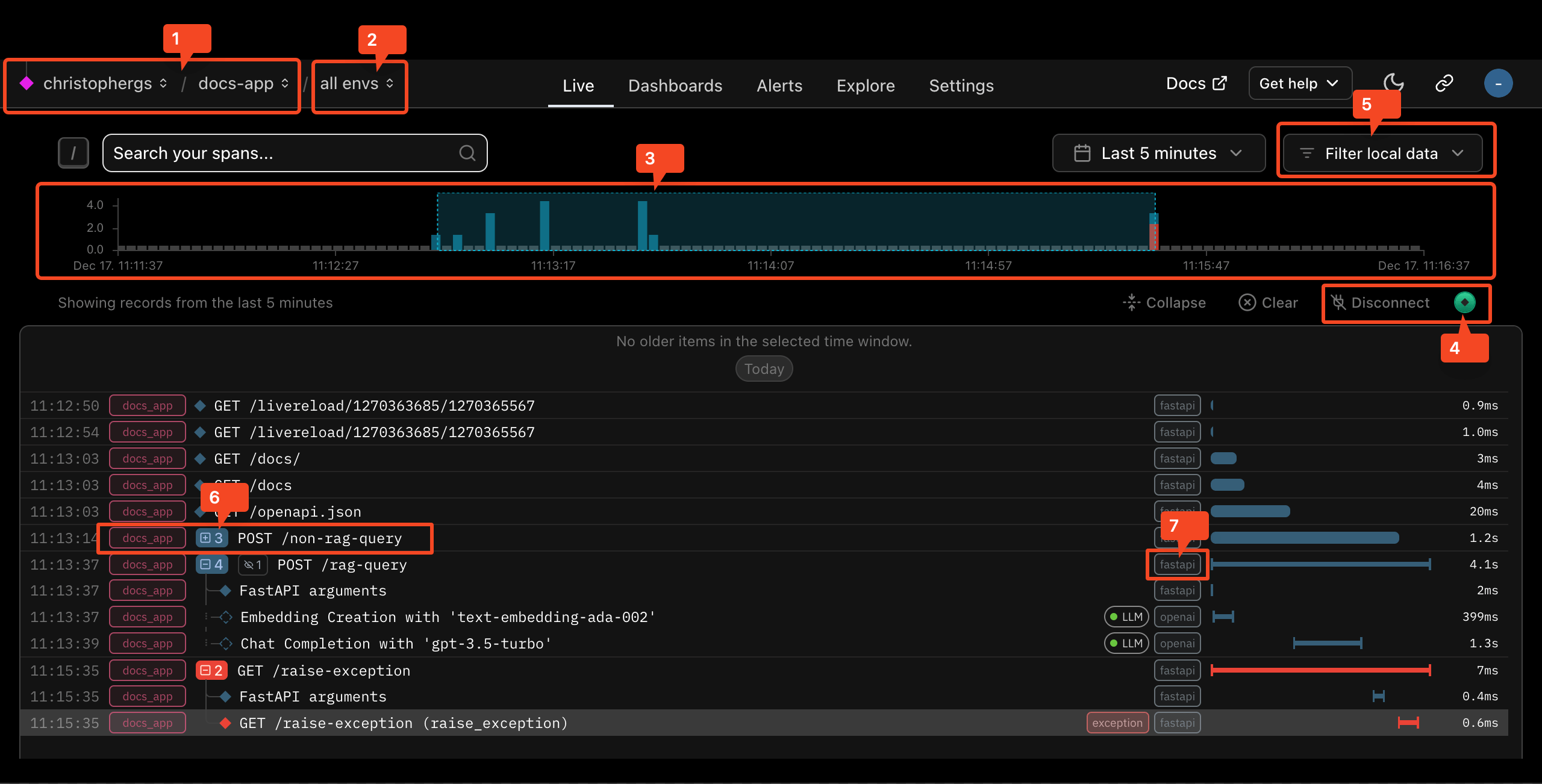 The live view is the focal point of Logfire, where you can see traces arrive in real-time.