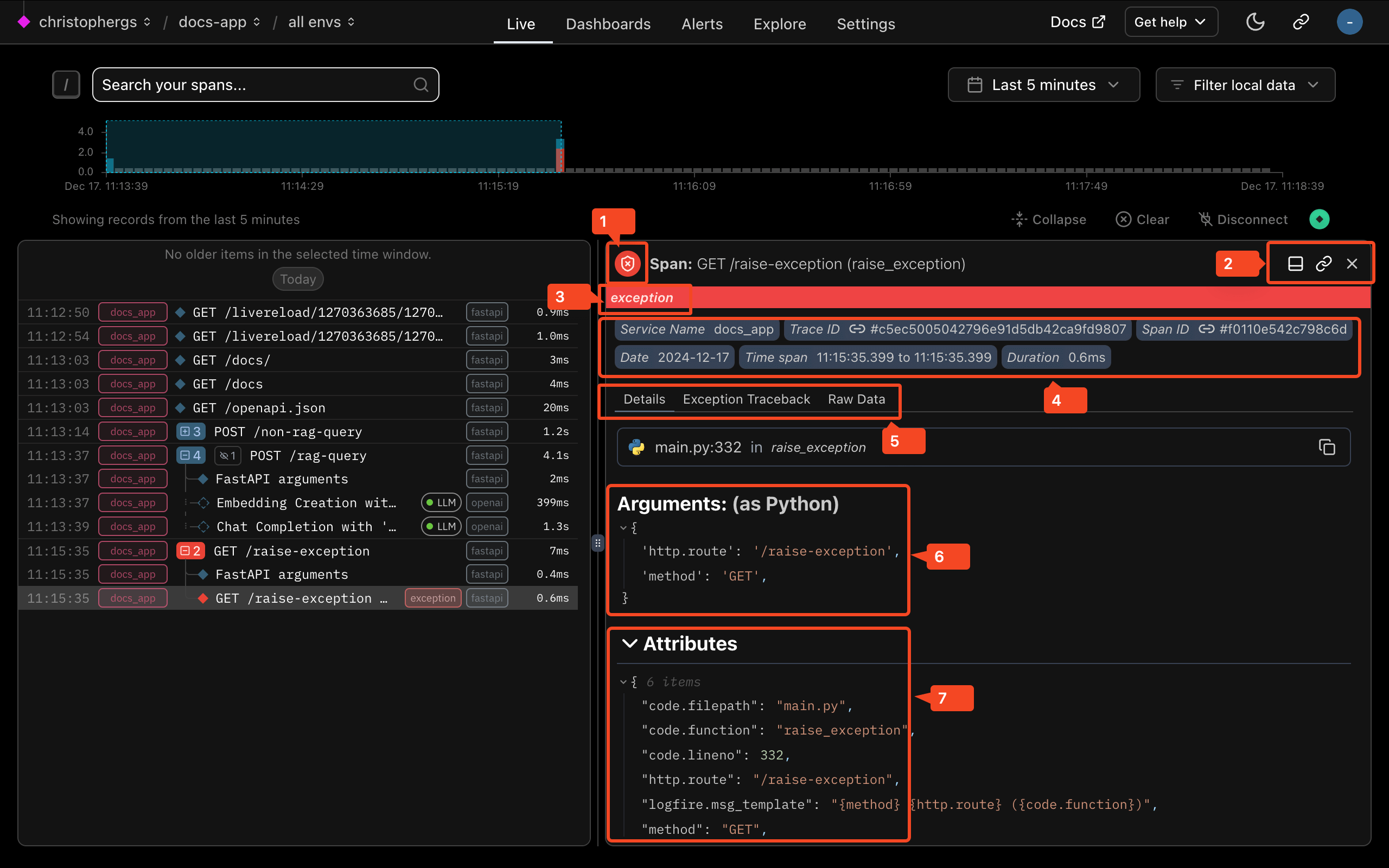 Exception warning: This exception indicator is present because an exception bubbled through this span. You can see more details in the Exception Traceback details tab.